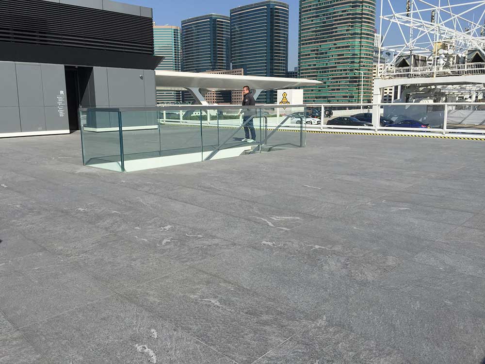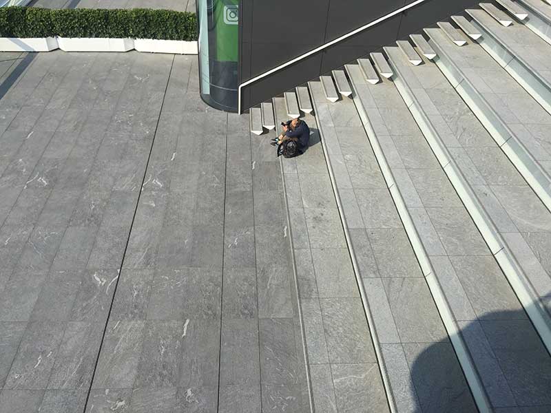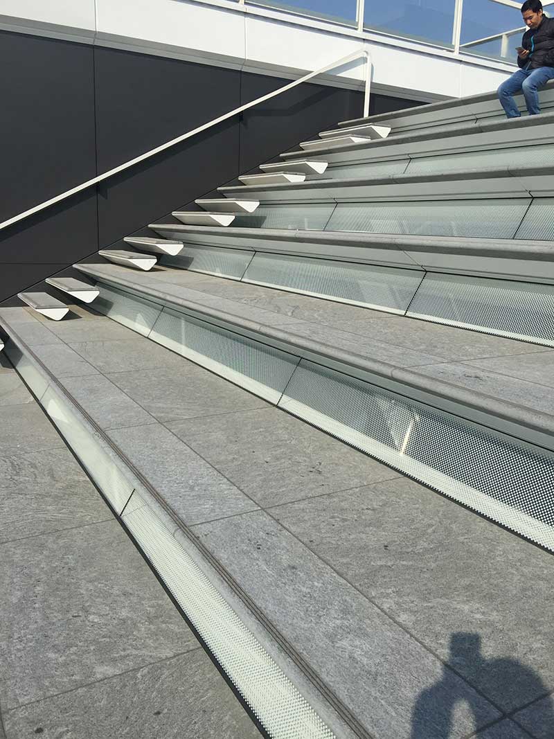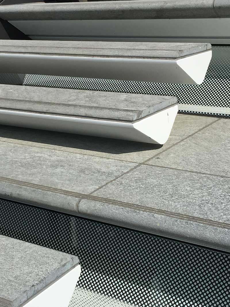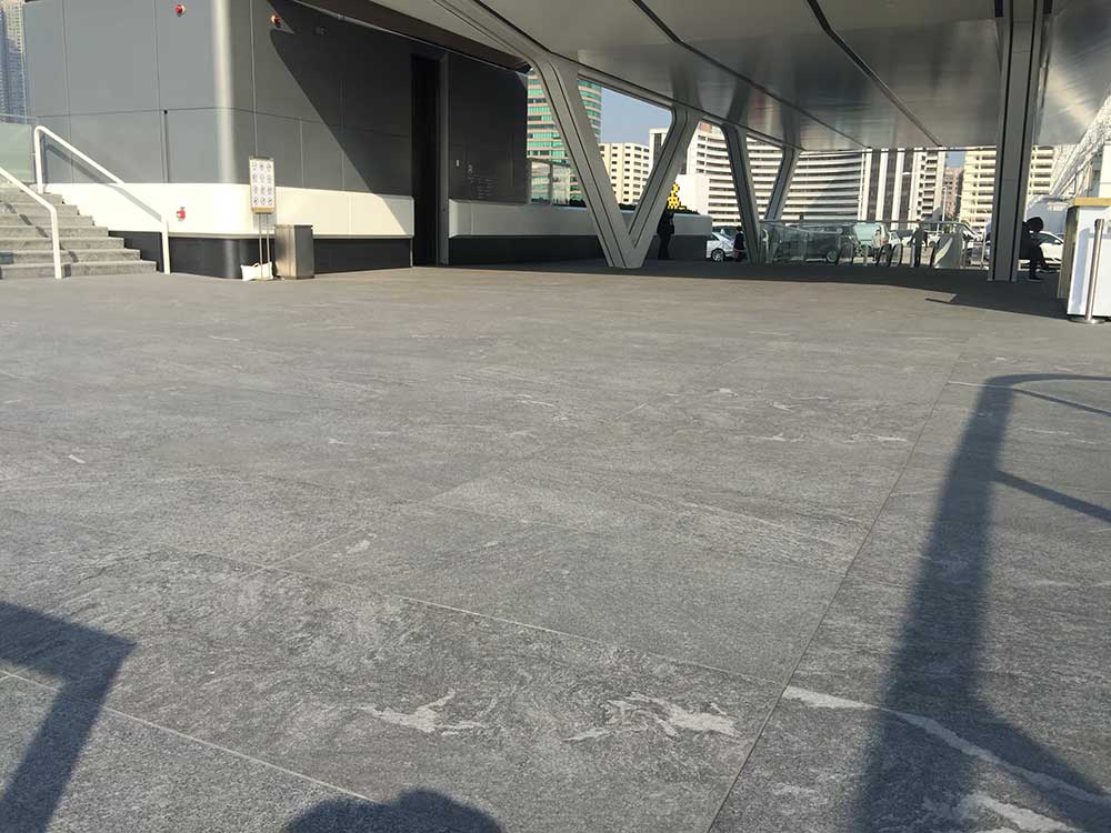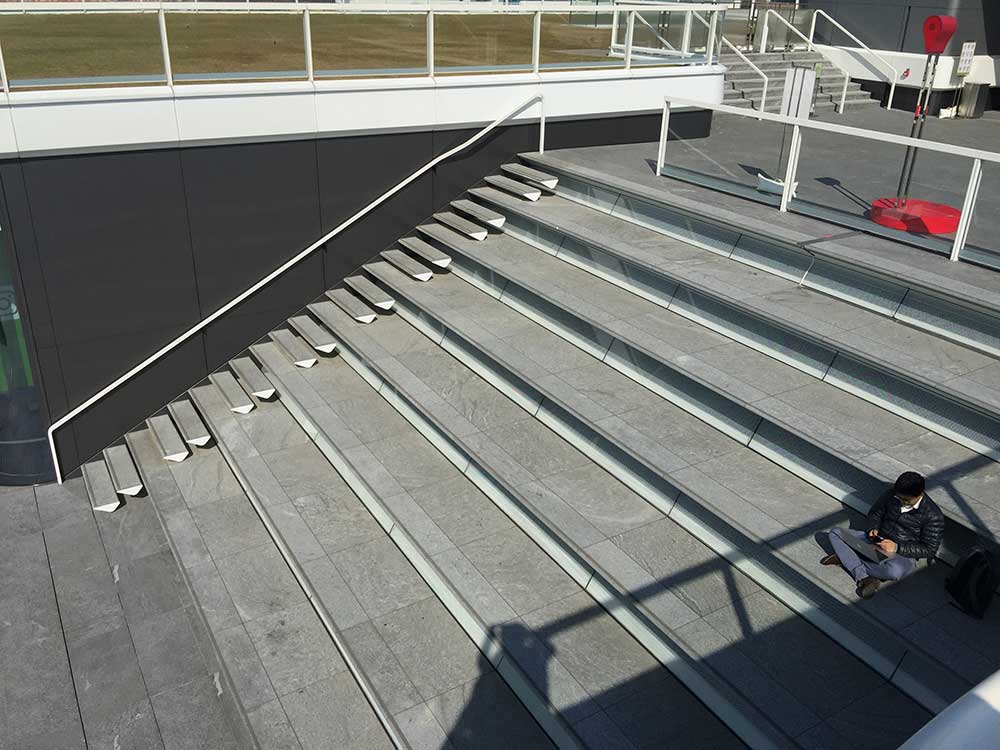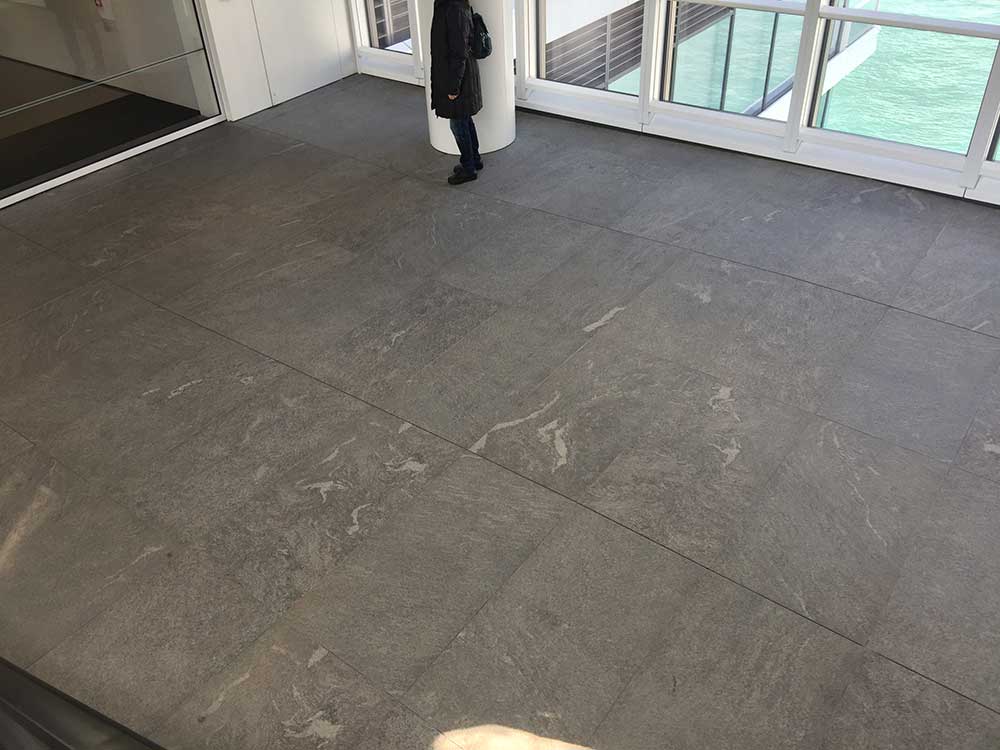 Die ganze Außenfläche ist ungefähr 7000 m2 groß und wurde mit gesintertem Stein L’Altra Pietra Colosseo Grigioni 60x120x2 cm.
