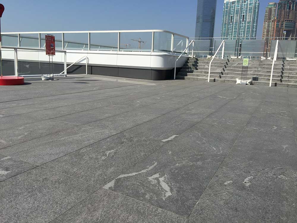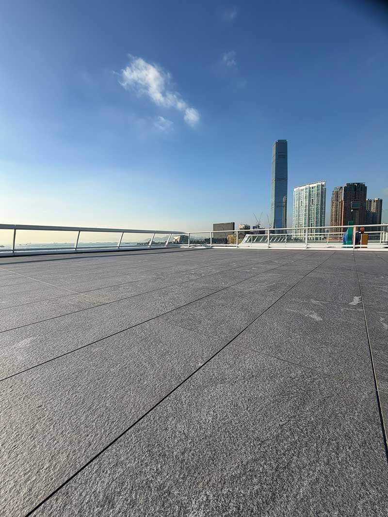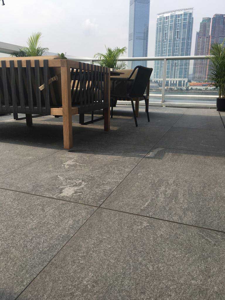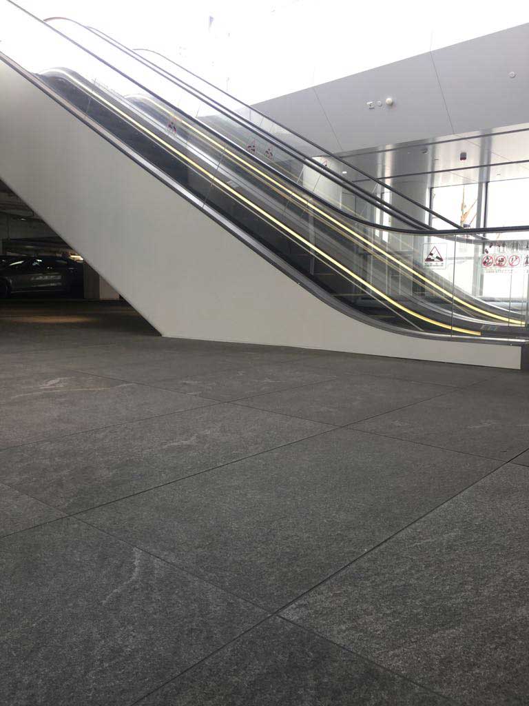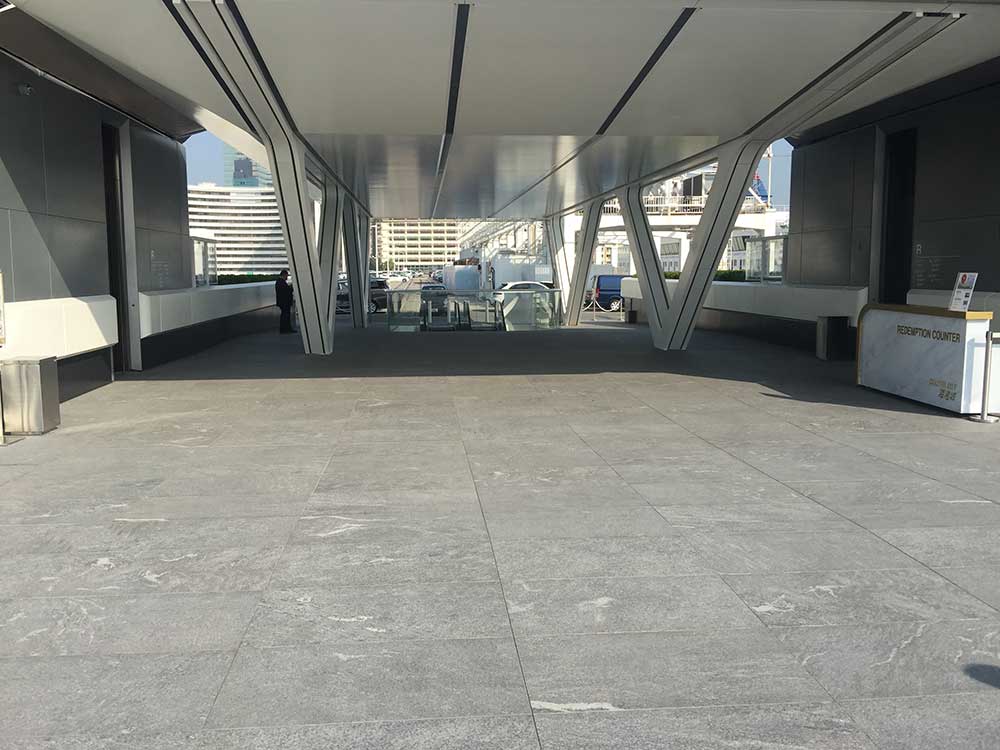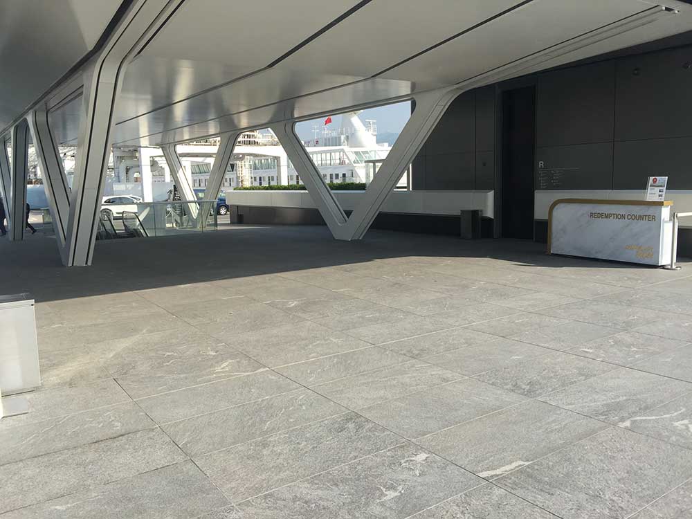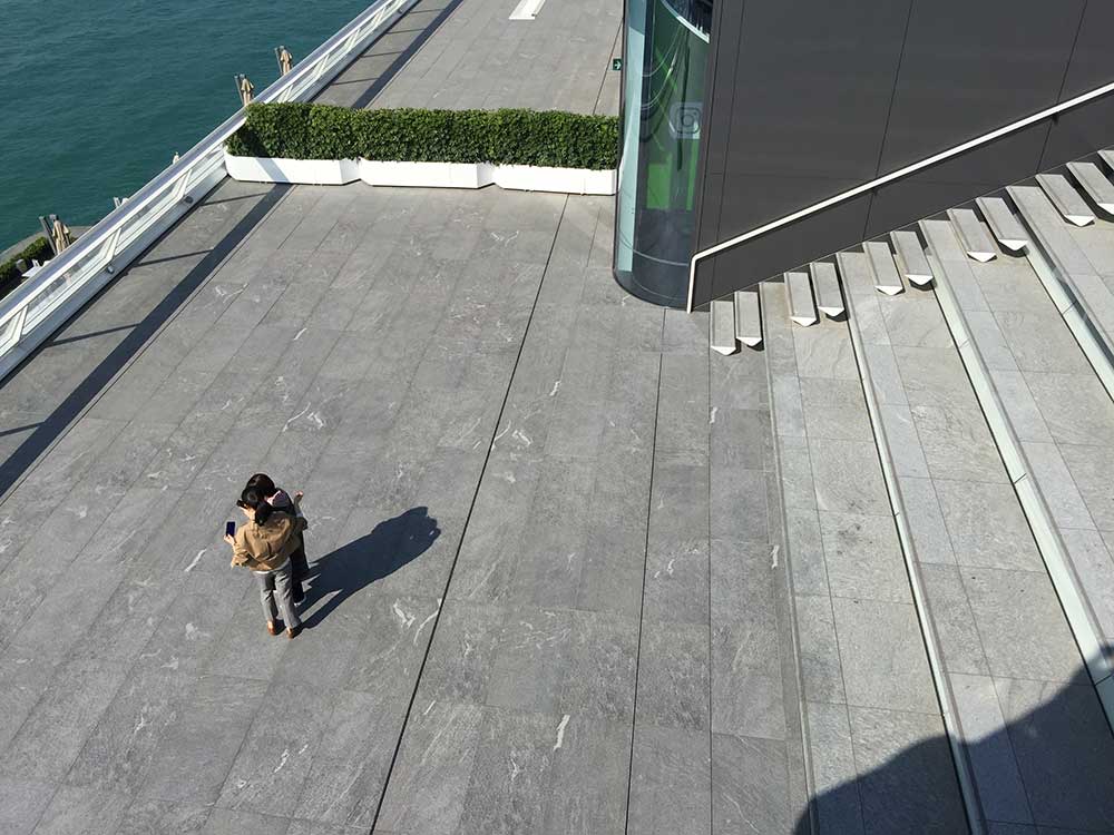 Die ganze Außenfläche ist ungefähr 7000 m2 groß und wurde mit gesintertem Stein L’Altra Pietra Colosseo Grigioni 60x120x2 cm.