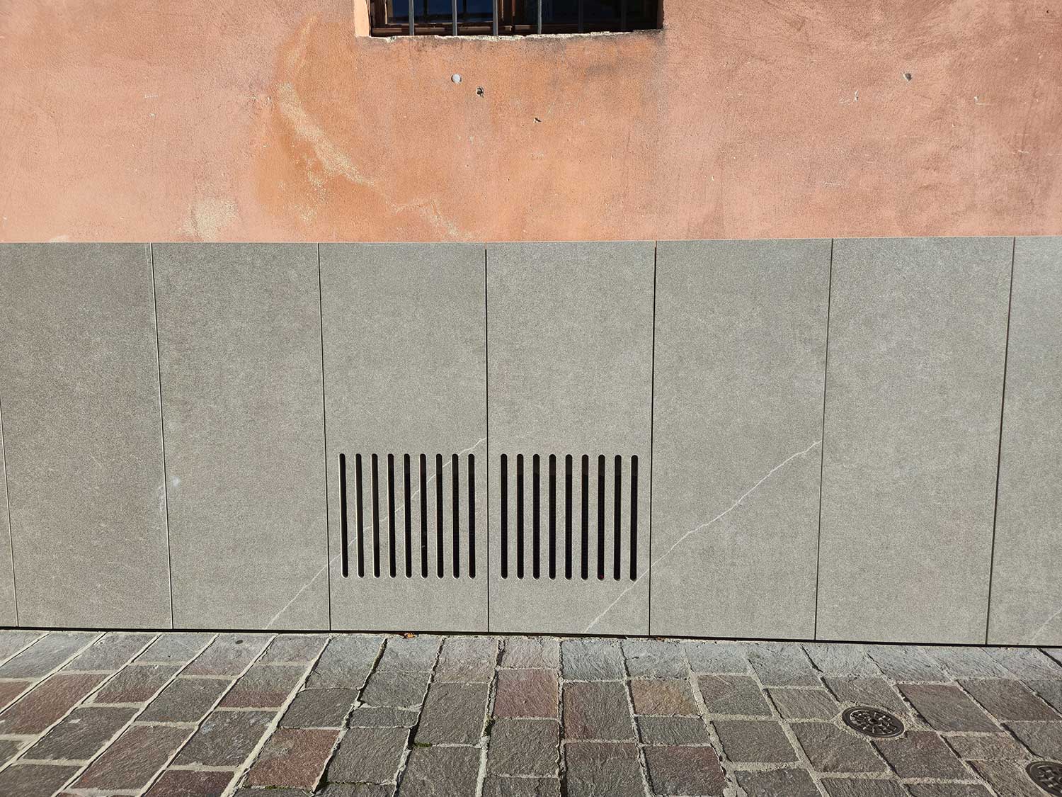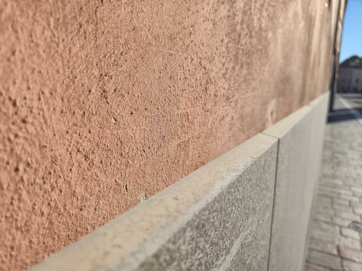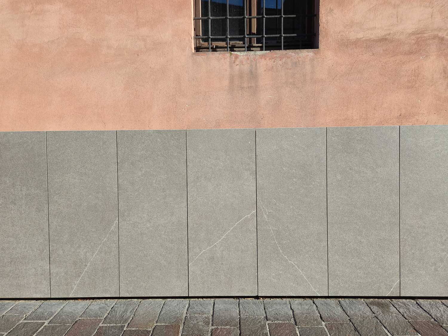 The natural grey surface of COLOSSEO Bressa blends seamlessly with the warm tones of the original façade, enhancing the contrast between the stone plinth and the plastered walls above. Subtle tonal movements and delicate mineral details give the building an elegant, robust and contemporary character.