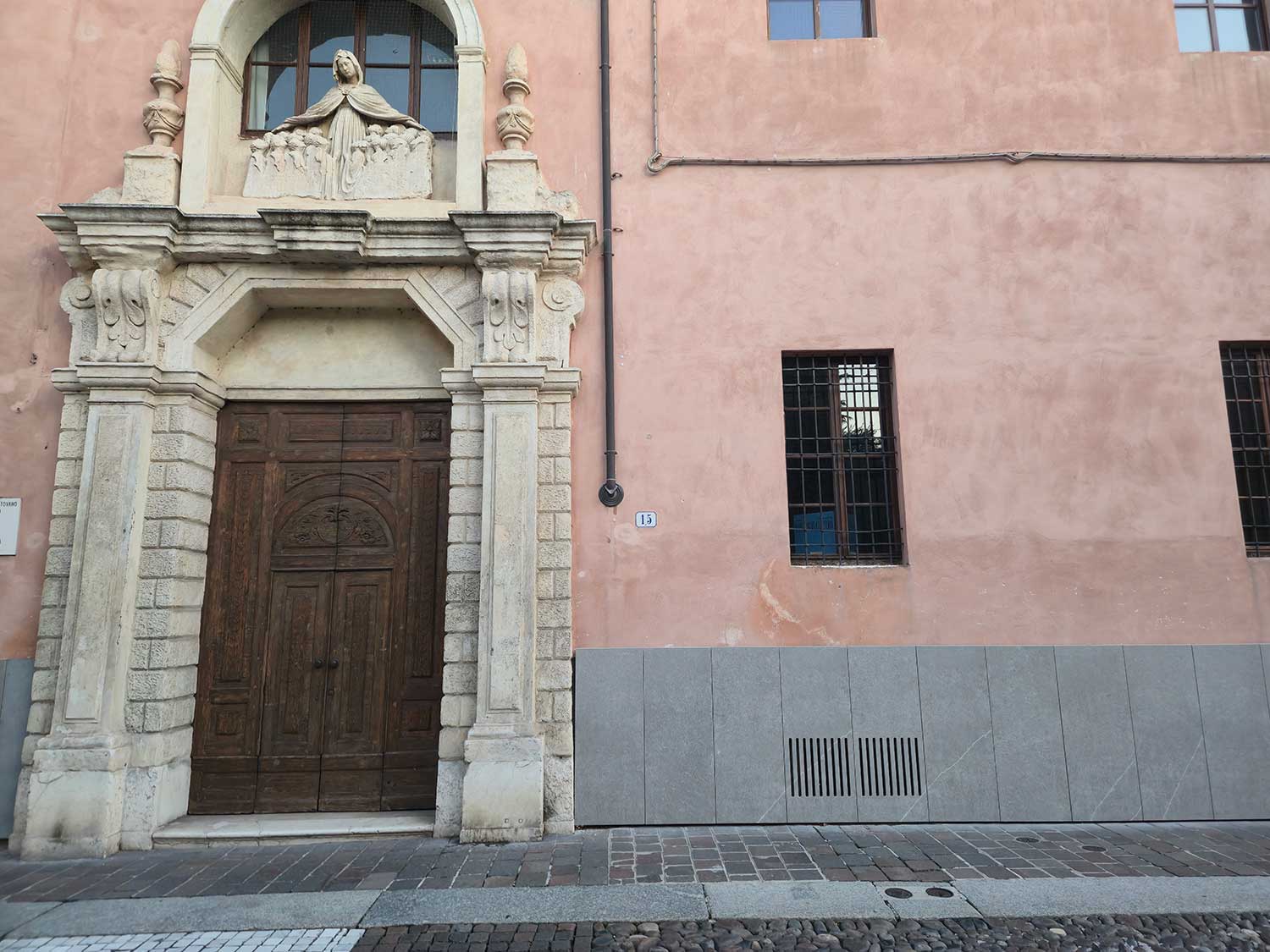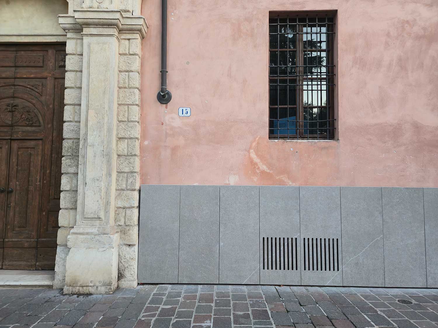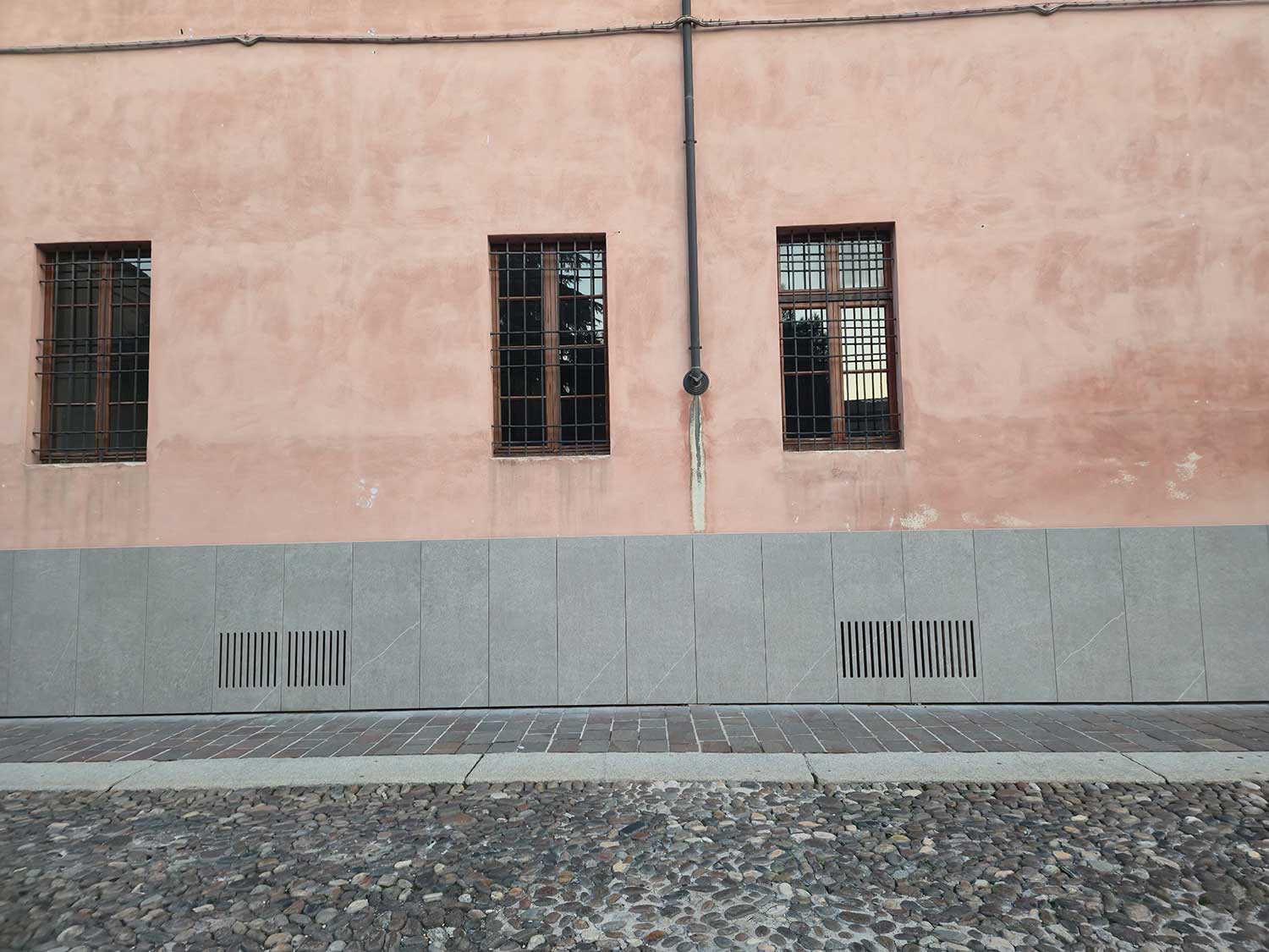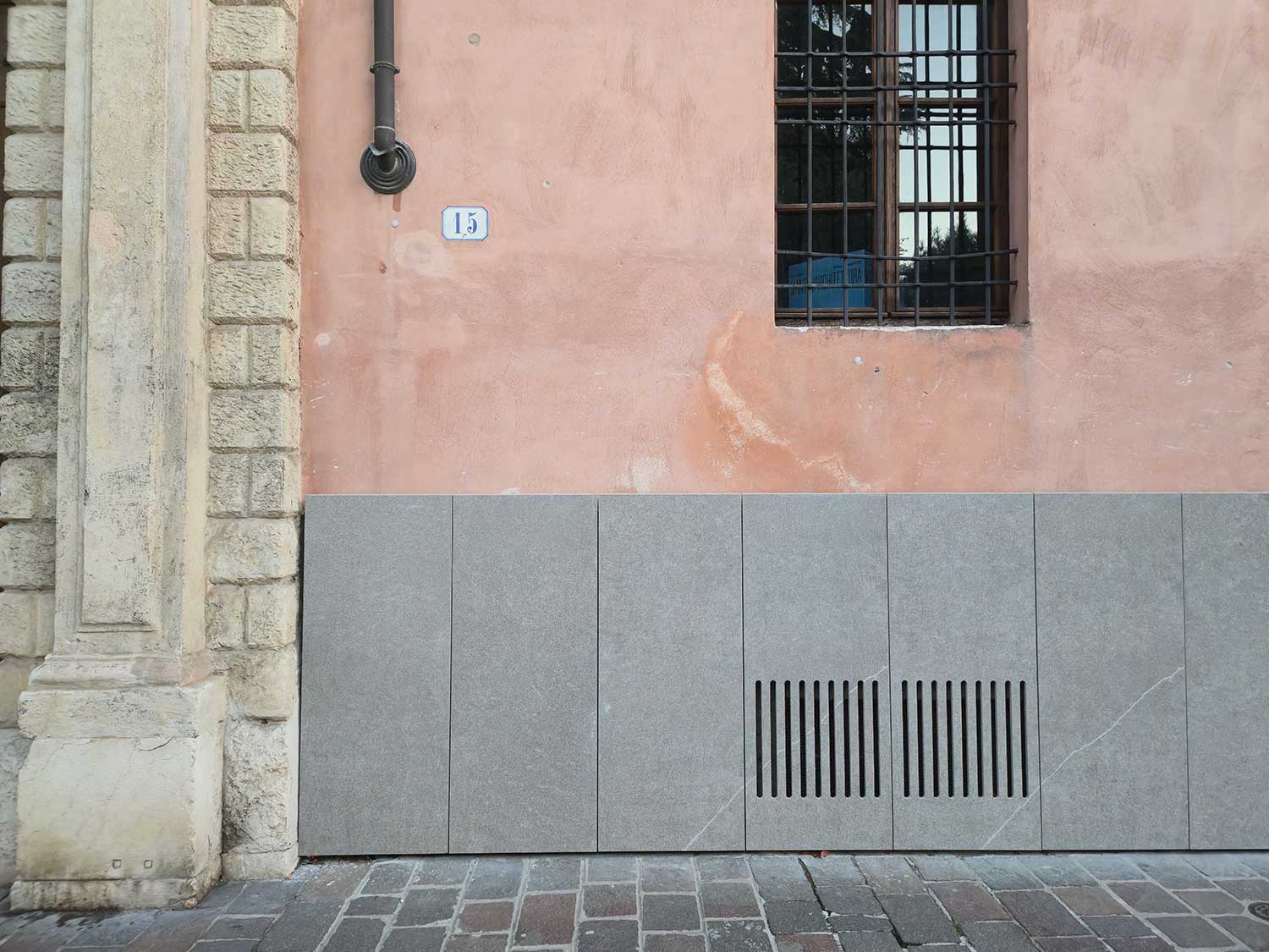 The natural grey surface of COLOSSEO Bressa blends seamlessly with the warm tones of the original façade, enhancing the contrast between the stone plinth and the plastered walls above. Subtle tonal movements and delicate mineral details give the building an elegant, robust and contemporary character.