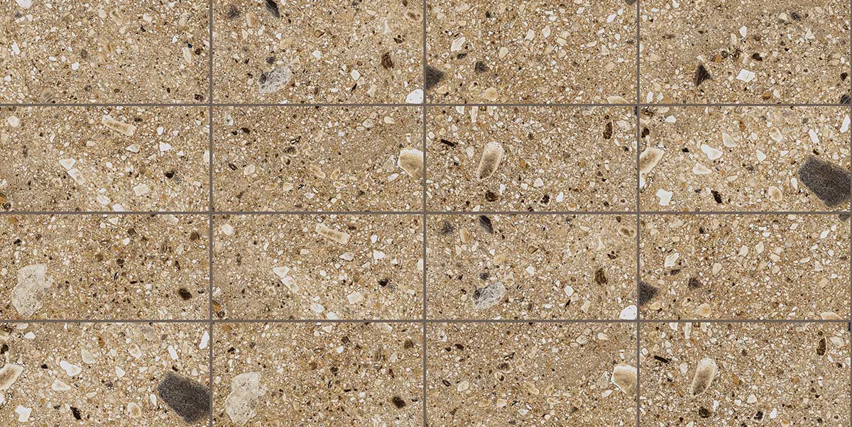 - Composizione cromatica calda ad alta espressività: La combinazione di beige minerali e inclusioni più scure genera superfici accoglienti ma mai monotone, ideali per valorizzare spazi outdoor contemporanei.