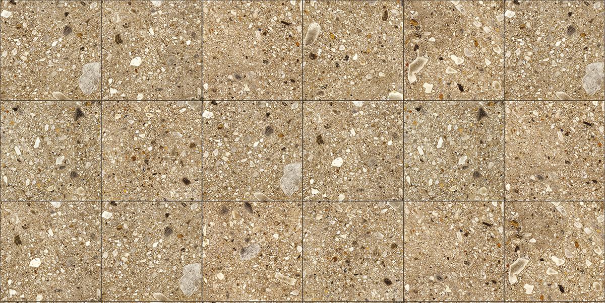 All’interno di questo fondo si inserisce una trama complessa di frammenti lapidei eterogenei, distribuiti in modo naturale e non ripetitivo. Le inclusioni spaziano da toni chiari come avorio e crema fino a sfumature più intense di ocra, ambra e bruno profondo, generando un equilibrio visivo tra parti calde e contrasti più marcati.