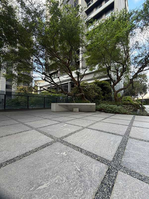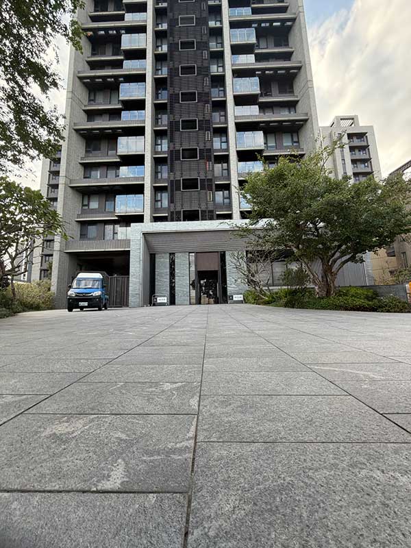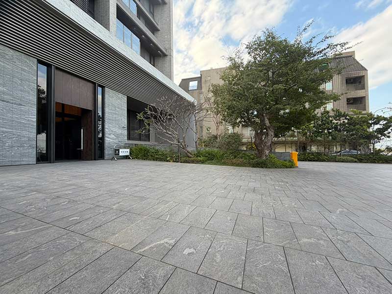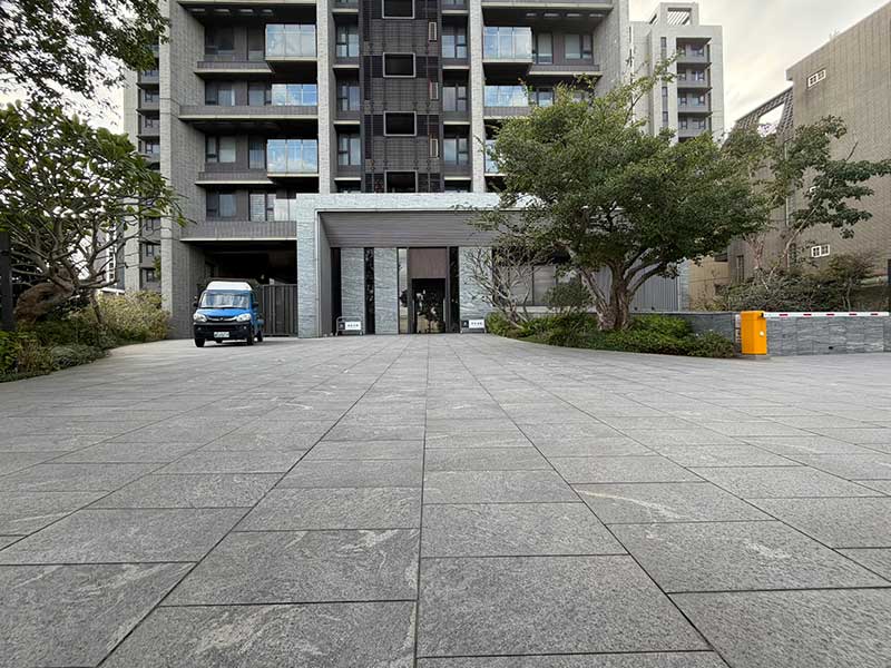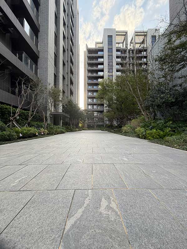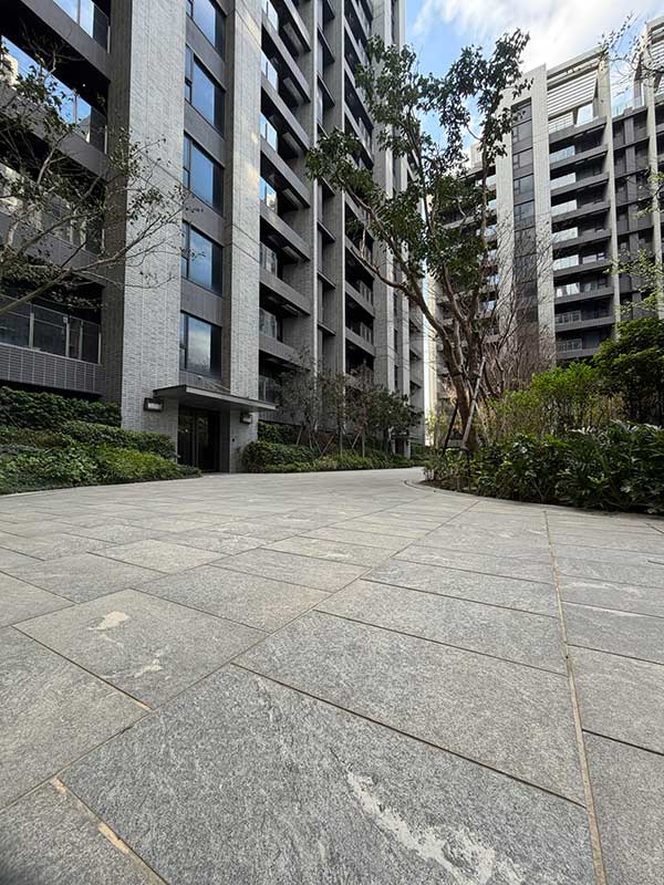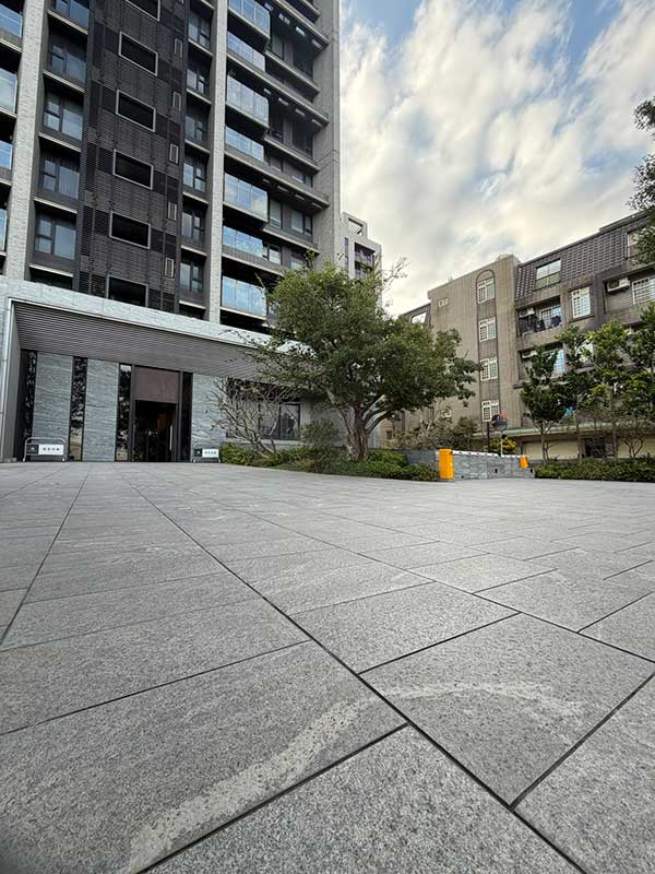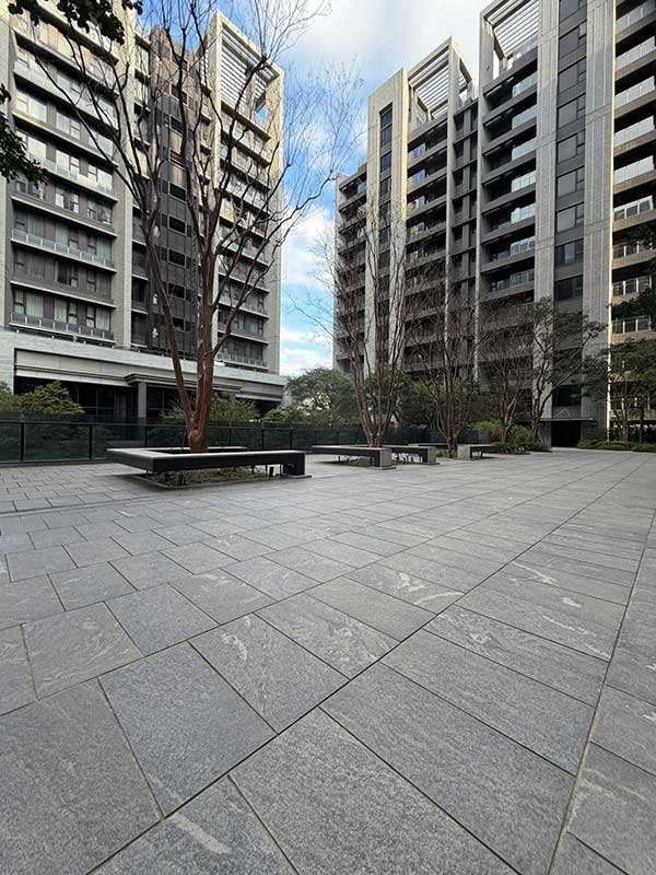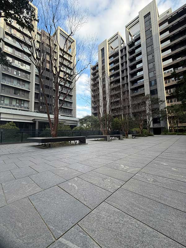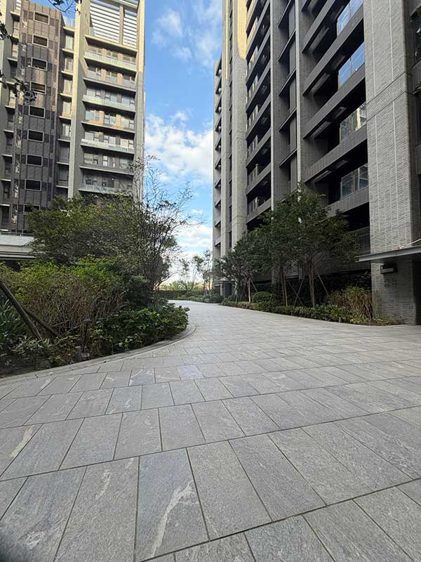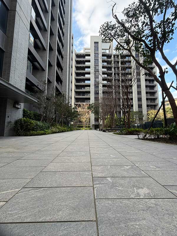 Nel 2025, a Taoyuan in Taiwan, è stata realizzata la pavimentazione esterna in pietra sinterizzata di un complesso residenziale contemporaneo utilizzando L’ALTRA PIETRA 2CM Colosseo Grigioni nei formati 30×60×2 cm, 60×60×2 cm e con elementi lavorati su misura.