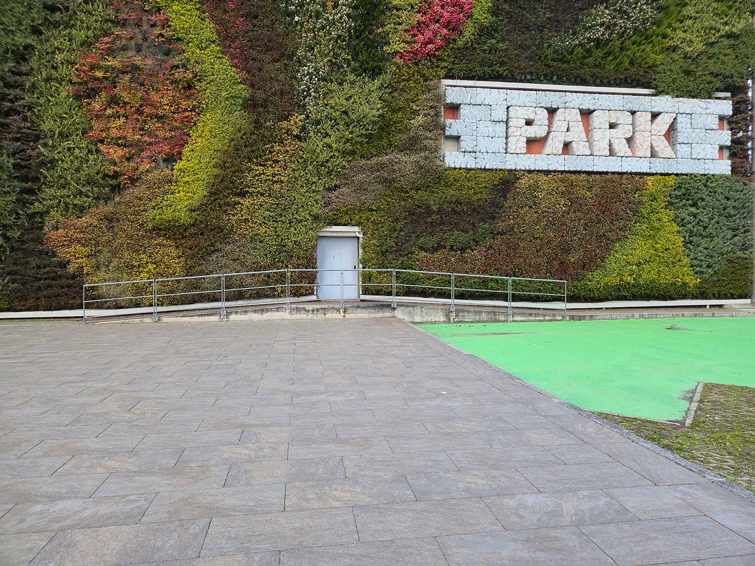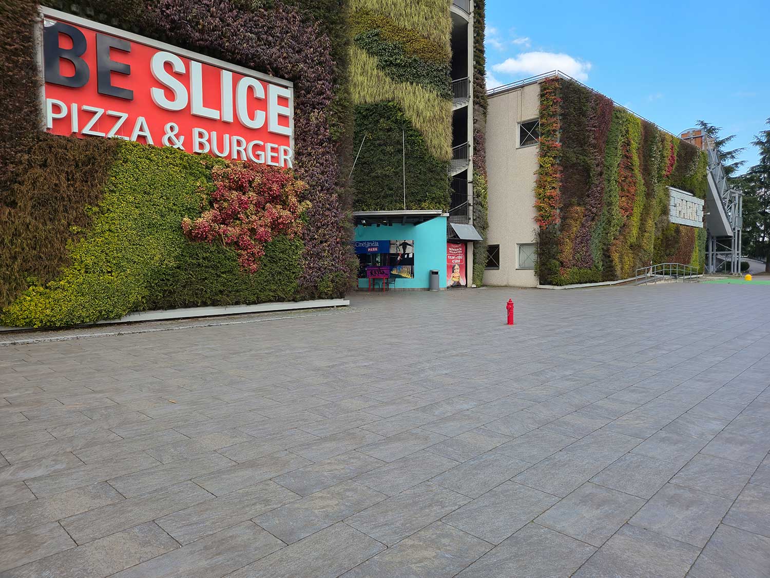 La particolare cromia mix, caratterizzata da movimenti minerali e variazioni che spaziano tra grigi, beige e tonalità più calde, dona profondità visiva e armonia, dialogando perfettamente con l’iconica facciata verde del complesso. L’effetto complessivo è raffinato, naturale e perfettamente integrato con l’architettura circostante.