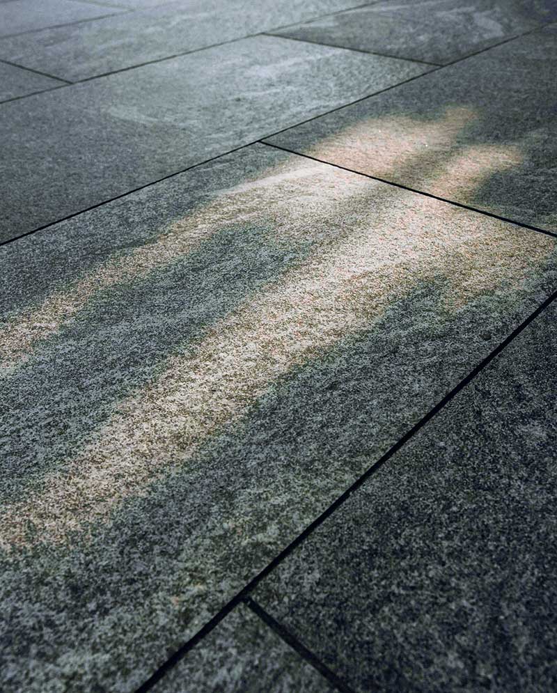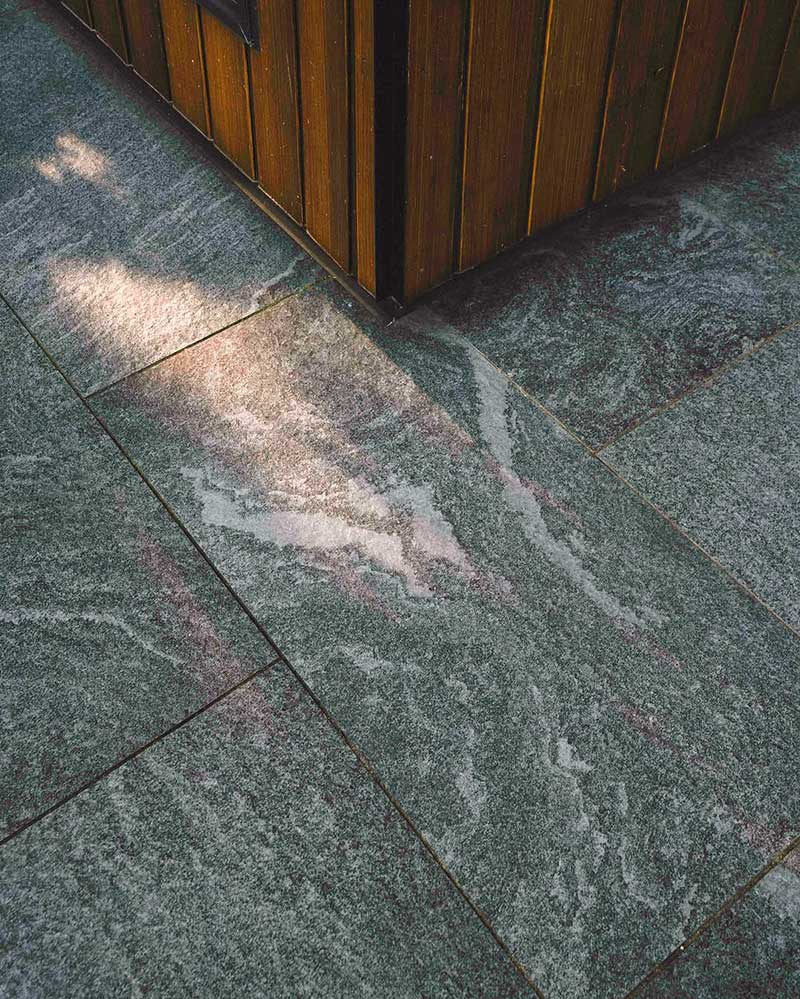 Dal punto di vista estetico, Colosseo Grigioni si distingue per una cromia grigio naturale con leggere sfumature verdi e delicate venature che richiamano la matericità della pietra naturale. La superficie presenta un movimento grafico equilibrato, capace di dare profondità senza risultare invasivo. Questa caratteristica rende la pavimentazione perfettamente integrata con il paesaggio boschivo circostante e con gli elementi architettonici in legno e pietra.