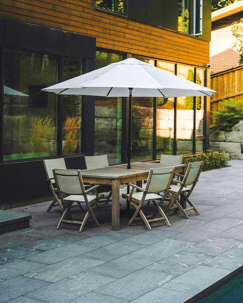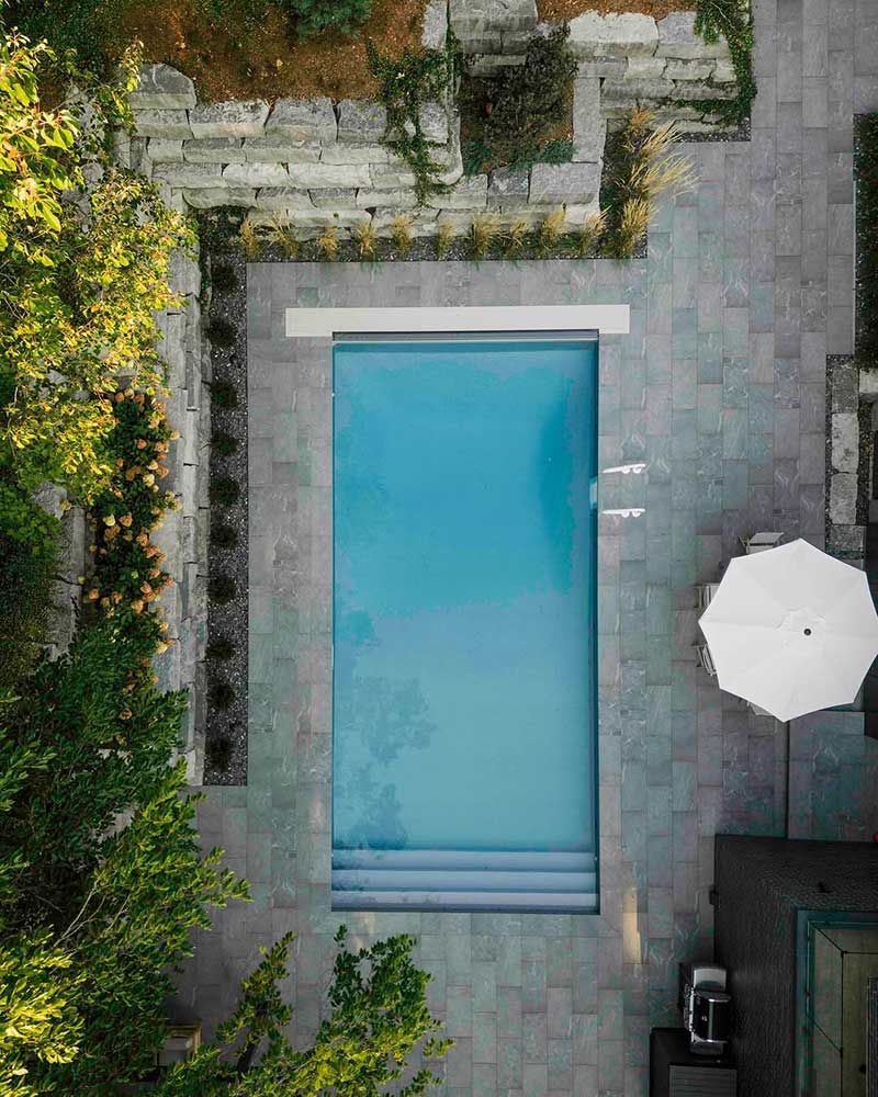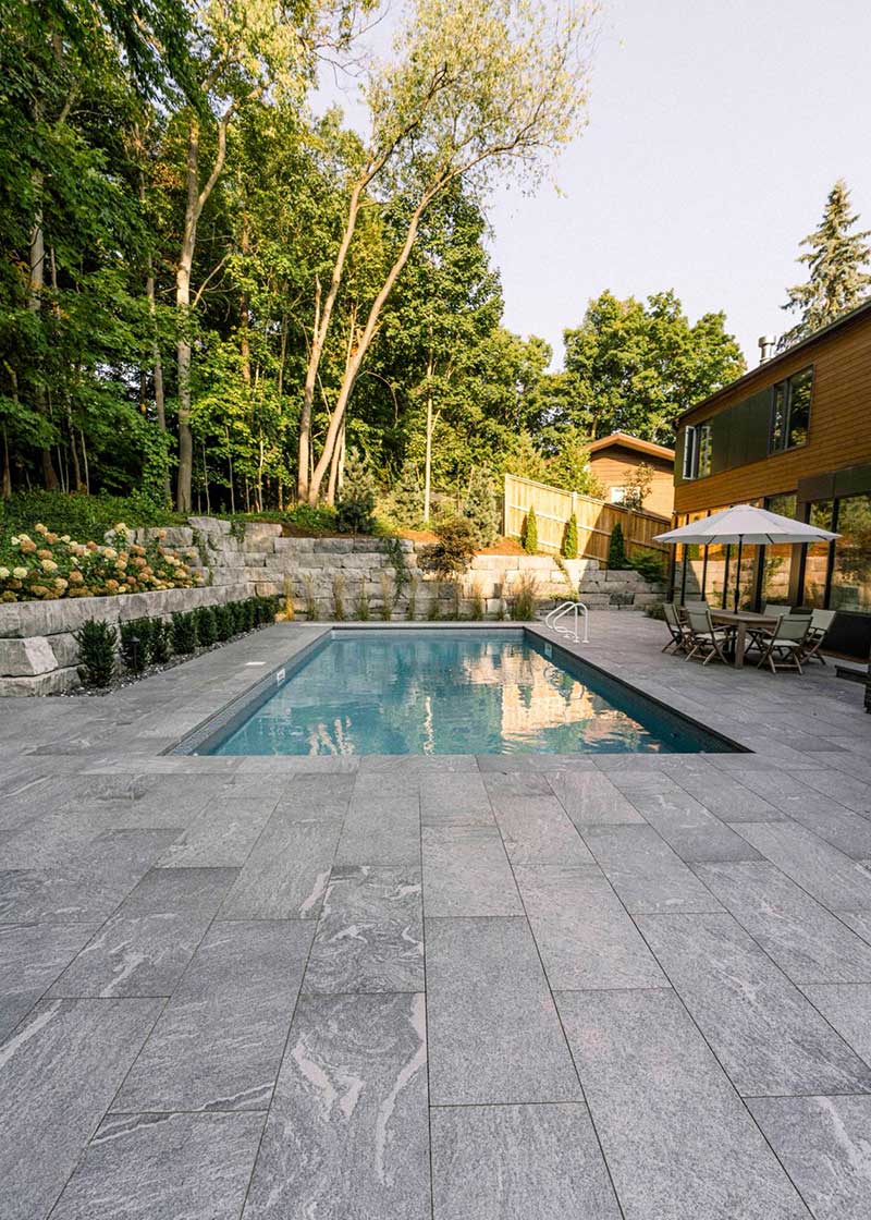 Nel 2024, a Waterloo in Canada, sono stati realizzati gli spazi esterni di una villa privata con piscina attraverso la posa di una pavimentazione in pietra sinterizzata L’ALTRA PIETRA Colosseo Grigioni 45×90×2 cm.